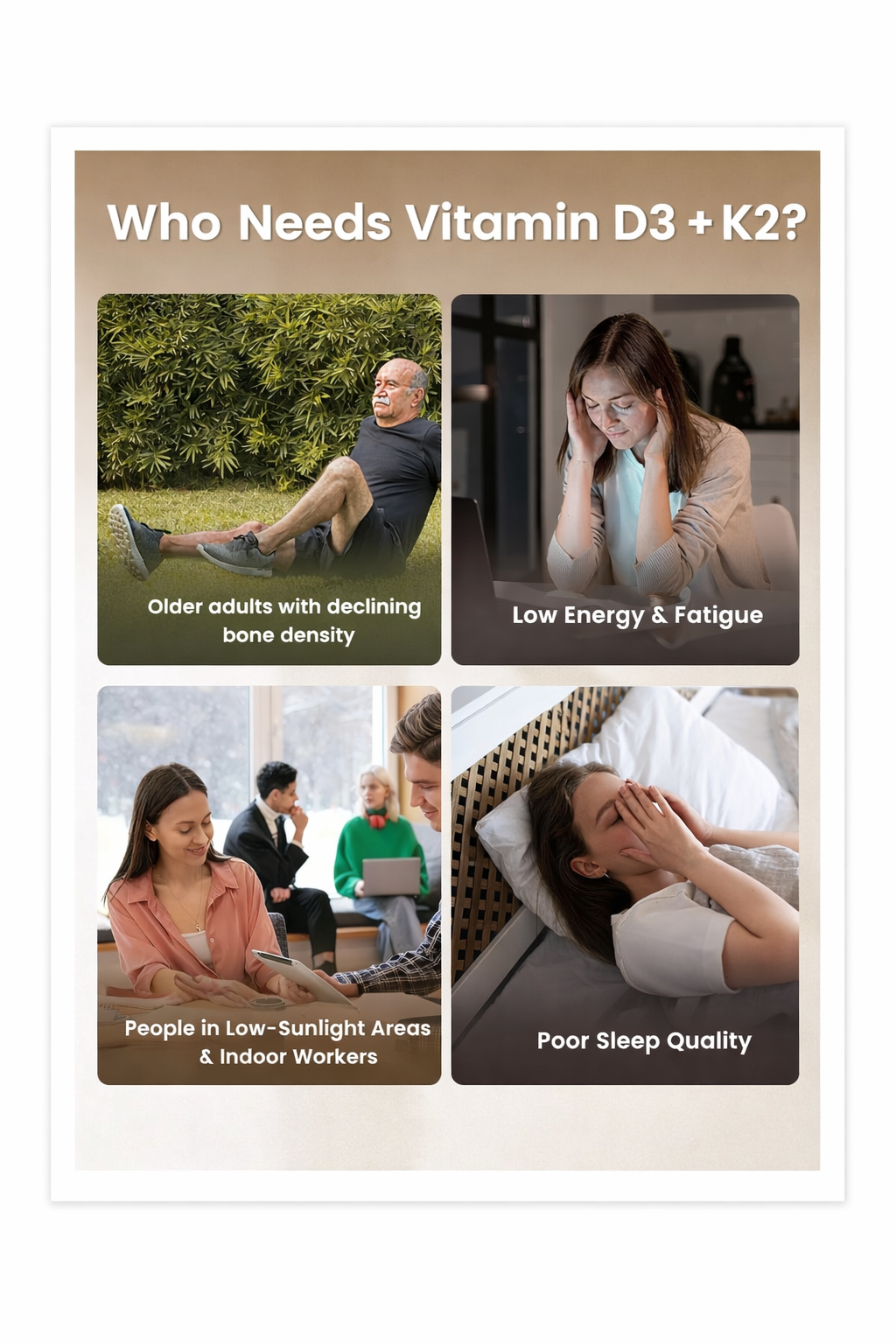 By guiding calcium into bones and away from joints and arteries, the D3 + K2 combo helps support long-term mobility.